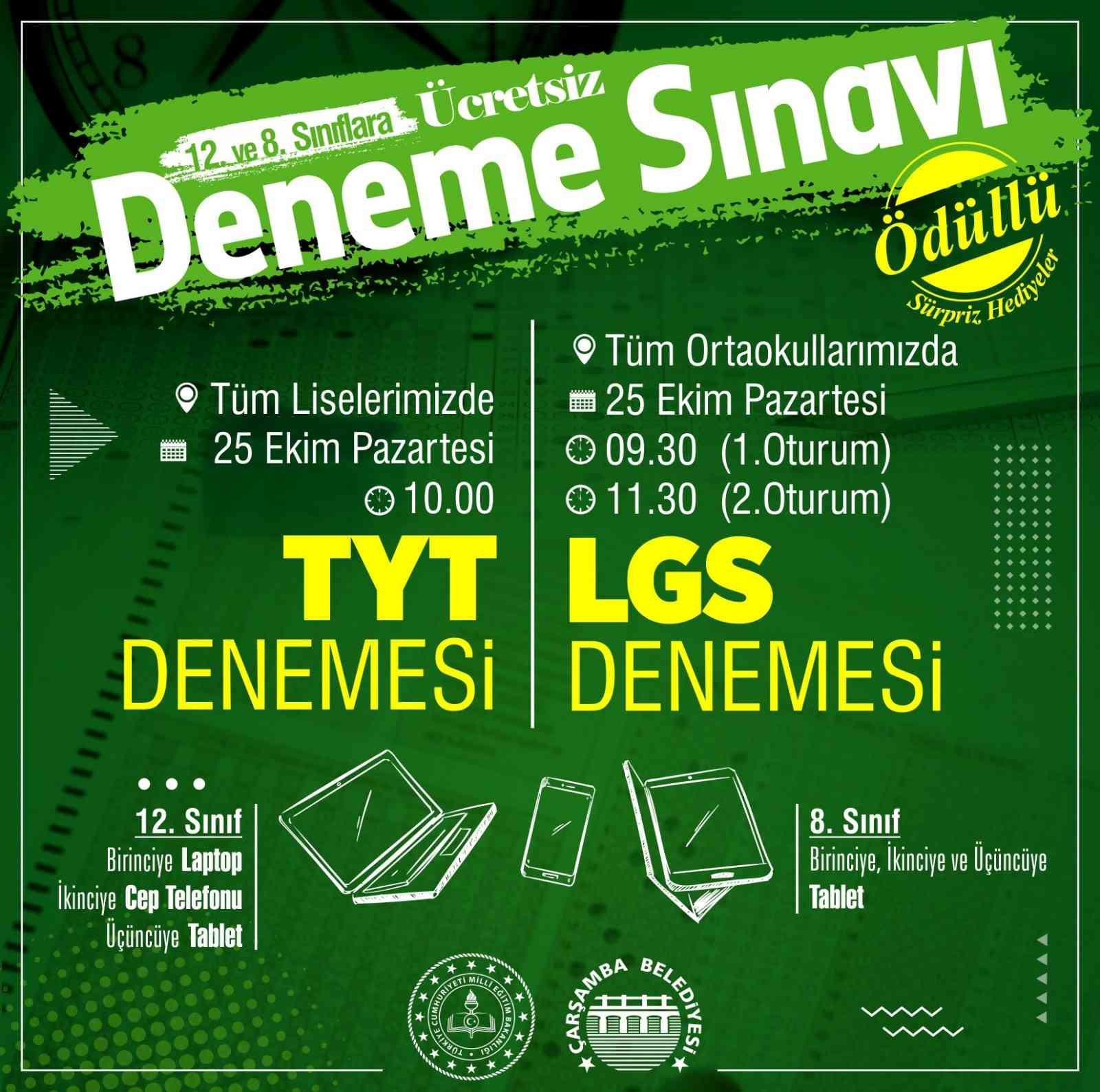 25 Ekim Pazartesi günü, Çarşamba genelindeki tüm lise son sınıf öğrencilerine, saat 10.00’da TYT denemesi; tüm ortaokul son sınıf öğrencilerine 1. oturum 09.30 – 2. oturum 11.30 şeklinde LGS denemesi yapılacak.