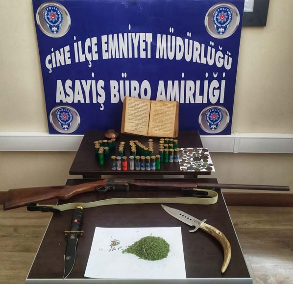 Edinilen bilgiye göre, Sarıoğlu Mahallesi’nde ihbar üzerine Çine Belediyesi’nde zabıta olarak görev yapan N.T.’ye ait evde arama yapıldı. Yapılan aramada 15 gram esrar maddesi olduğu değerlendirilen uyuşturucu madde, 53 adet üzerinde Osmanlıca yazı olduğu değerlendiren metal sikke, 1 adet tarihi değeri olduğu düşünülen Osmanlıca yazı bulunan kitap, 2 adet kama, 1 adet tek kırma tabir edilen ruhsatsız av tüfeği, 52 adet değişik markalarda dolu fişek ele geçirildi. Polis ekipleri tarafından gözaltına alınan N.T. savcılık tarafından serbest bırakıldı.