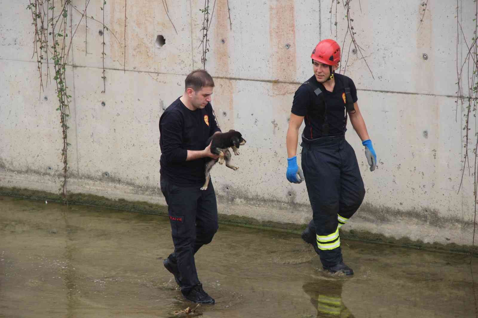 Dere yatağında mahsur kalan yavru köpeği itfaiye ekibi kurtardı