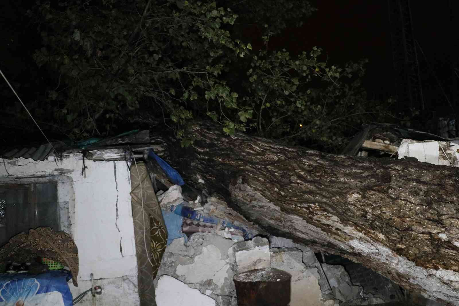 Sağanak yağış sebebiyle 15 metre boyunda ağaç iki müstakil evin çatısına devrildi