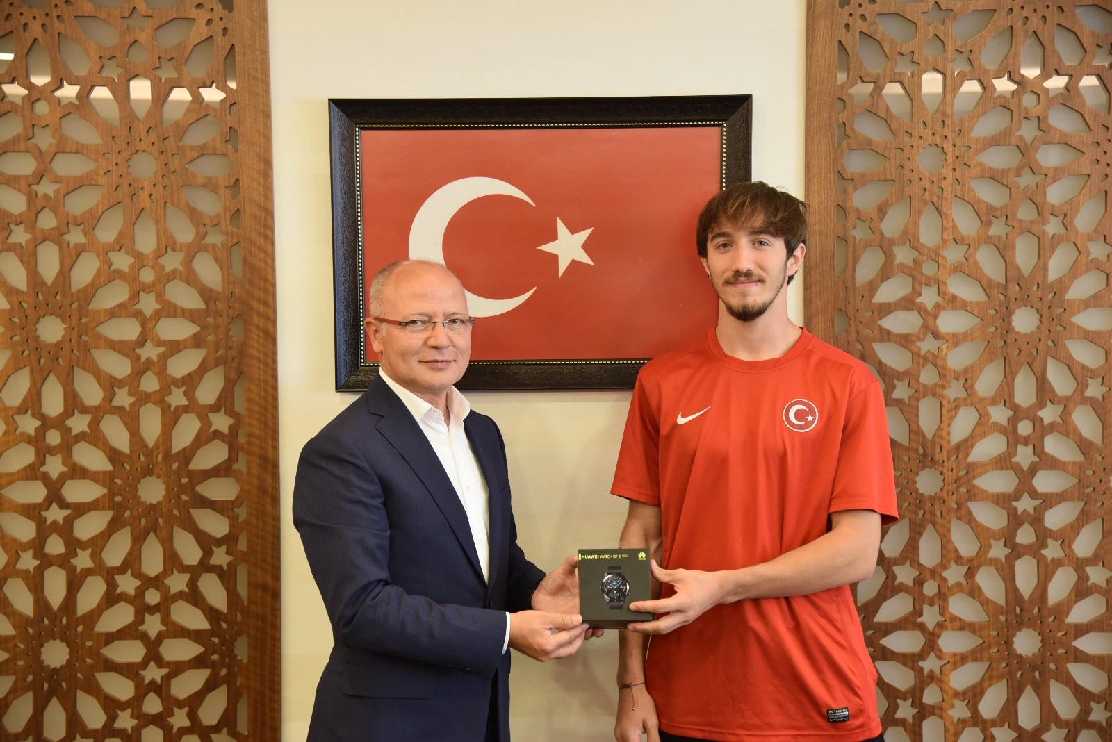Dünya U20 Şampiyonası’nda 400 metre engellide altın madalya kazanan millî sporcu Berke Akçam, AK Parti Bursa İl Başkanı Davut Gürkan’ı ziyaret etti.